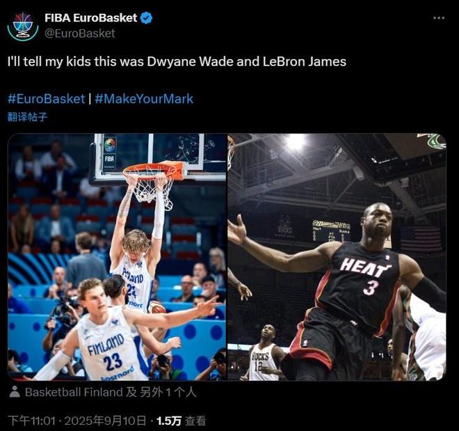 直播吧9月11日讯 男篮欧锦赛1/4决赛,芬兰93-79战胜格鲁吉亚,闯进四强。赛后,男篮欧锦赛官方晒出了一张马尔卡宁和穆里宁两人复刻詹韦世界名画的照片。欧锦赛官方配文道:我会和我