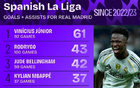 近3年皇马西甲参与进球榜:维尼修斯92场61球领跑 姆巴佩37场37球